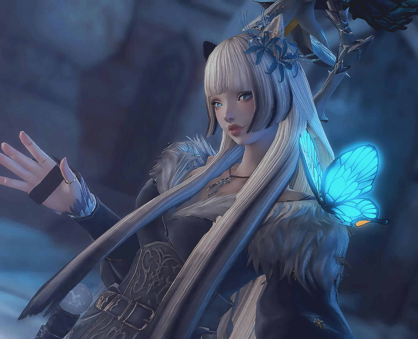 You will notice a small, blue butterfly following closely behind (or in front of) Oora. That is her companion, her seeing-eye Morpho, her champion. On her closest calls, it was the butterfly that saved her from the brink of death, pulled from succumbing to her injuries, and rescued her from the hands of the Lifestream.Throughout her numerous dances with death, her aether has taken a toll, a twist within itself, and Morpho has granted her the ability to function normally despite her conditions.Morpho is made up of multiple things. The memories of her former mentor, the invaluable knowledge from Nym, and unaspected Astral aether.